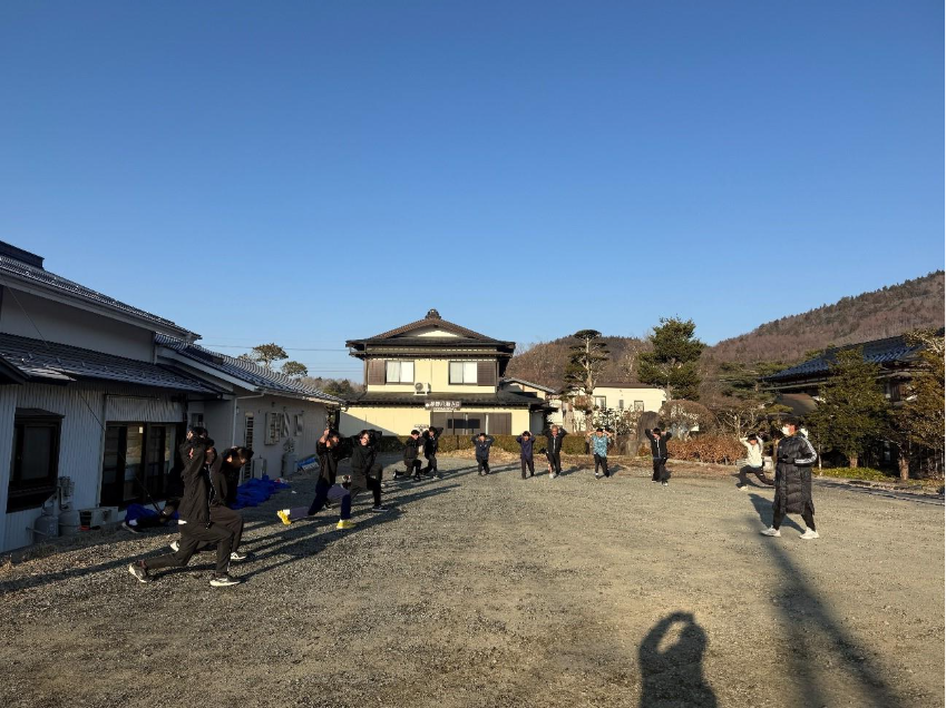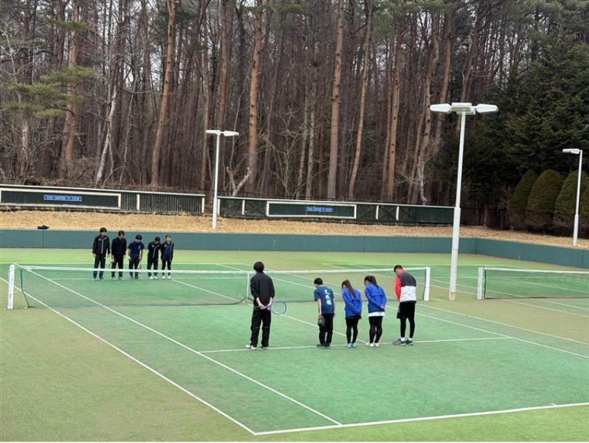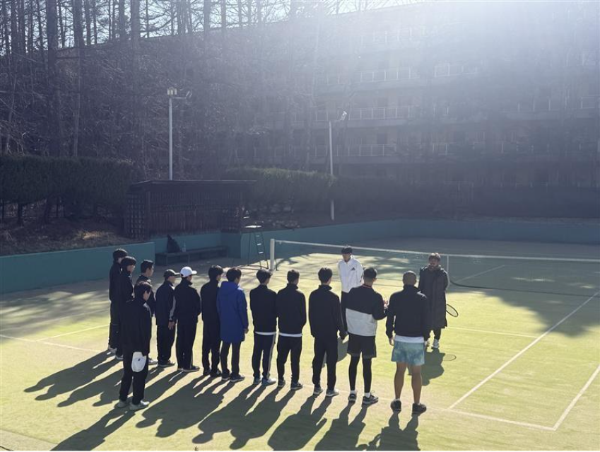 初日、現地に到着するとまだ東京よりも肌寒かったです。主に、手出しでストロークや2対1で振り回しラリーなどの基礎練を行いました。また、クレーコートが凍結していて使用できなかったのでオムニ5面を男女でうまく分け合い、臨機応変に対応できていたのでとても良かったです。夜のミーティングでは、初日から声が出ていて良かったなどの意見が出ました。