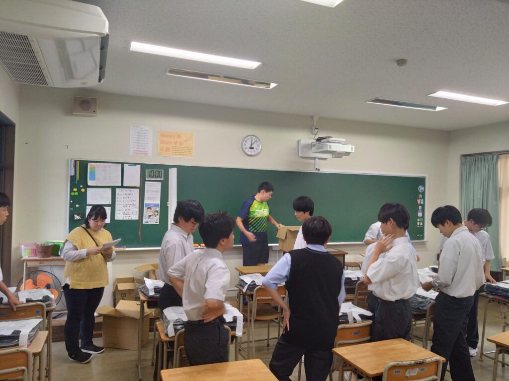 修学旅行の沖縄みやげをもらってはしゃぐ1年生…と思いきや、ちゃっかり他の2年生もいますね。