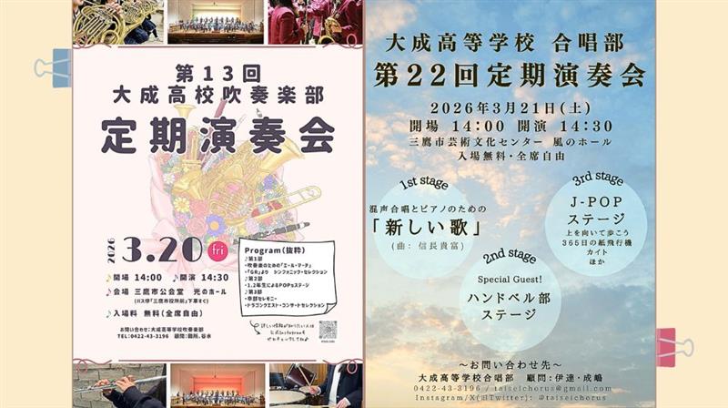大成高校合唱部は皆様に支えられ、今年で22回目の定期演奏会を迎えます。合唱に興味がある方も、そうでない方もお楽しみいただけるステージとなっています。ハンドベル部が奏でる美しいベルの響きにも注目です。大成合唱部の良さと合唱の楽しさを皆様に感じていただけるよう、部員一同心を込めて演奏します。ぜひお気軽にお越しください。