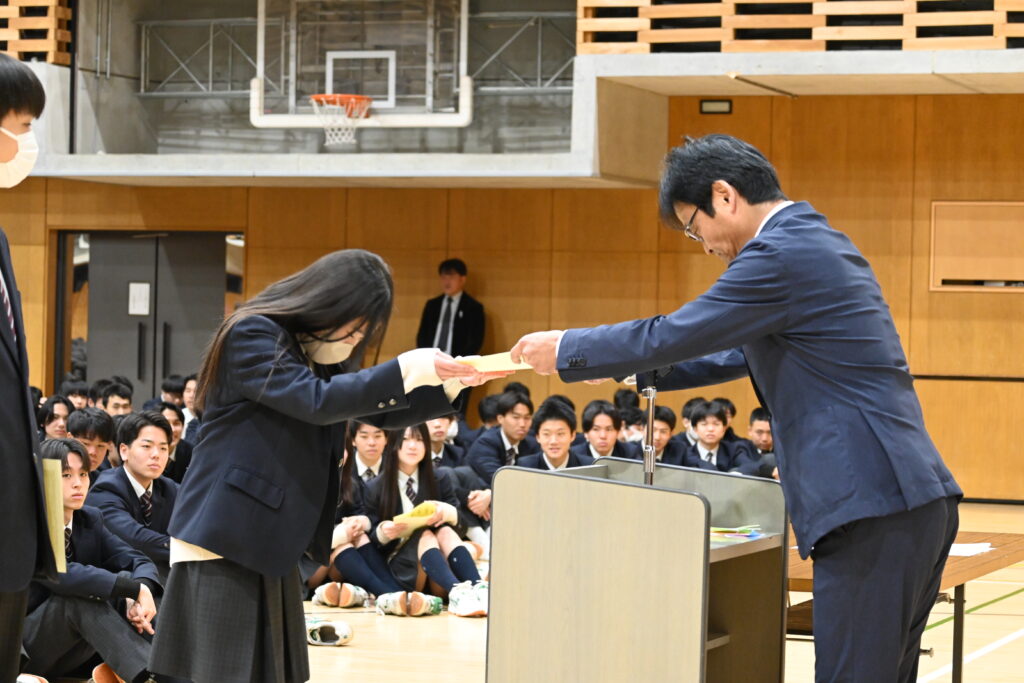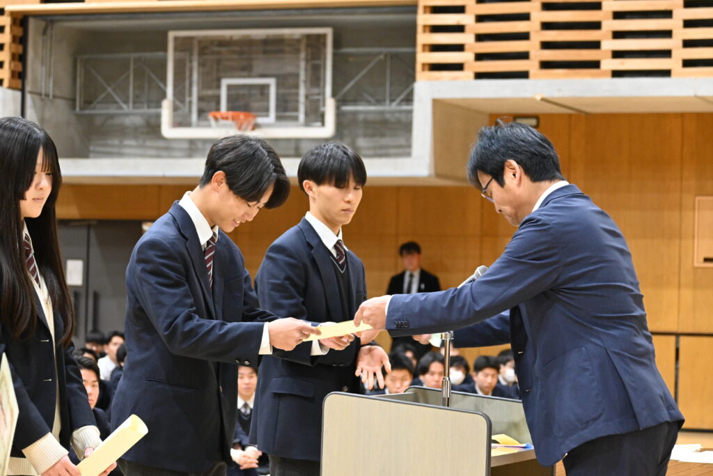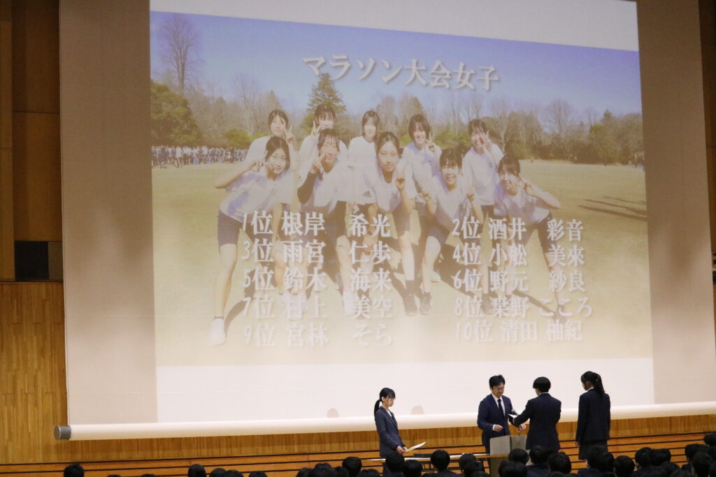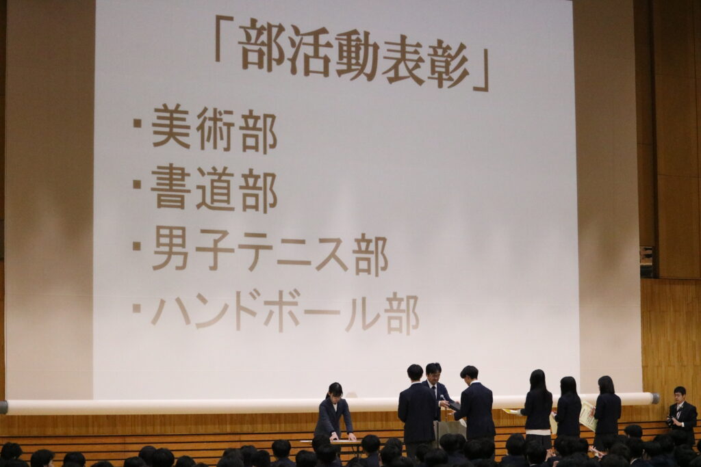 表彰の場面では、美術部、書道部、男子テニス部、ハンドボール部の代表者が登壇したほか、マラソン大会での優勝者にもあらためて賞状が手渡されました。
