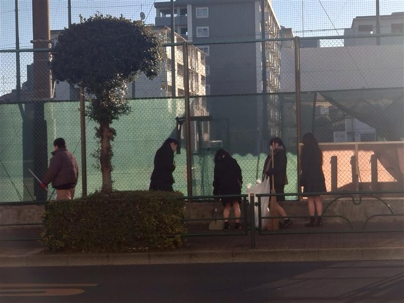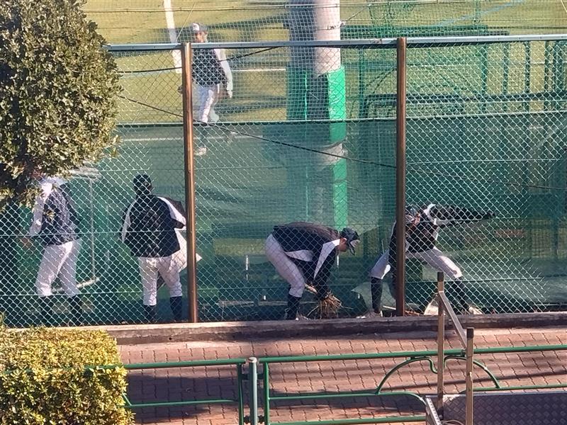 ③狭いネット裏で身を屈める、グラウンド清掃中の野球部